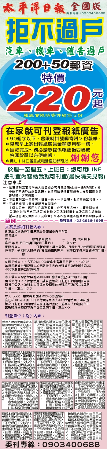 1天/則-220元起↑特惠價~{汽車.機車.催告.拒不.過戶]=200元費用+50掛號在家方便快速簡易刊登報紙廣告~拒不.催告.過戶刊登220元(附二報紙寄出)