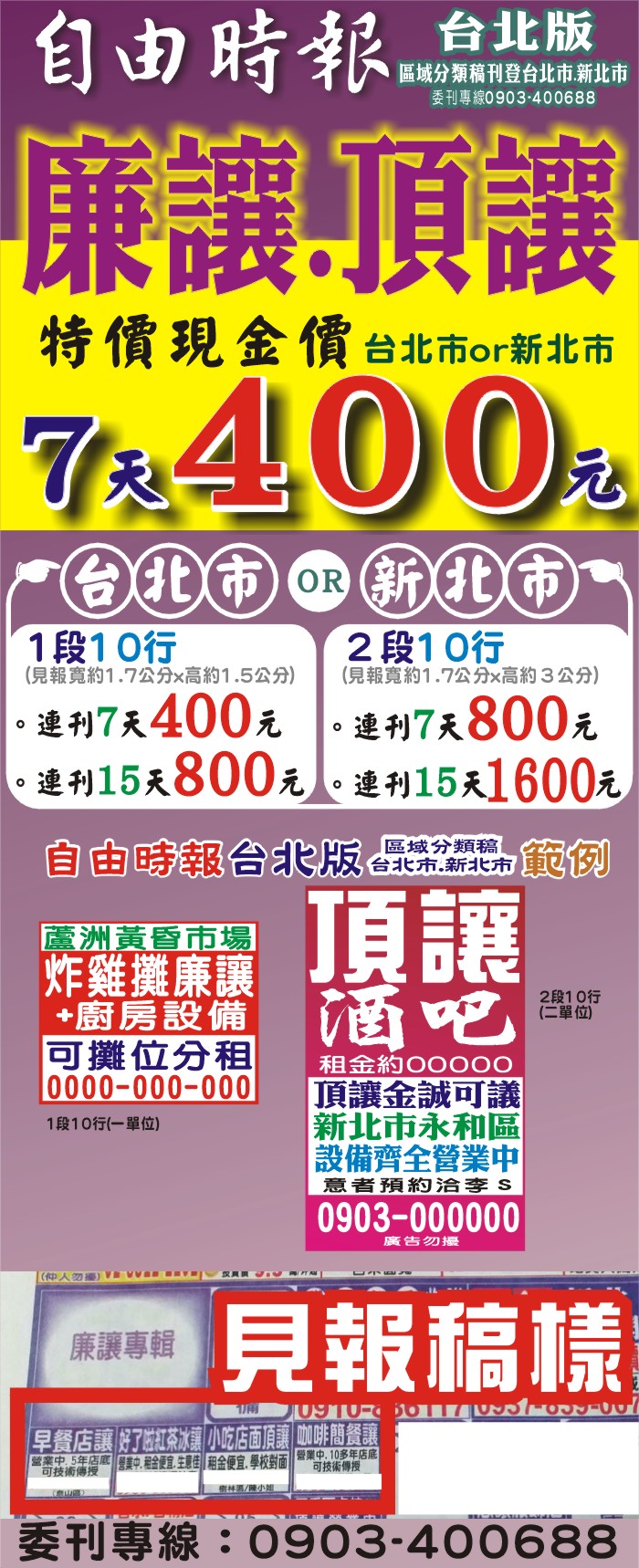- 刊登類型: 廉讓-台北版區域版分類廣告刊登-自由時報