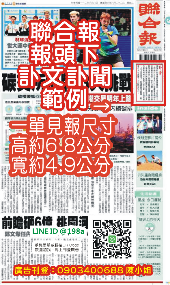 刊登聯合報報頭下全國版區域分類稿訃聞.訃文公告公示啟事啟示公告公示啟示啟事廣告報紙分類廣告,刊登房地報頭下全國版區域分類稿訃聞.訃文公告公示啟事啟示公告公示啟示啟事廣告報紙廣告,聯合報廣告,刊聯合報,登聯合報廣告,刊登聯合報廣告,商業廣告,人事廣告,營業廣告,分類廣告,道歉廣告,啟示廣告,聲明啟事廣告,形象廣告,公司產品廣告,開幕誌慶,招生廣告,科技商品廣告,製造商品廣告,刊登出租房地報頭下全國版區域分類稿訃聞.訃文公告公示啟事啟示公告公示啟示啟事廣告報紙廣告,售屋廣告,房地產,房屋出售等廣告等刊登報頭下全國版區域分類稿訃聞.訃文公告公示啟事啟示公告公示啟示啟事廣告報紙,聯合報刋登,刊登聯合報廣告,刊登聯合報廣告,聯合報分類廣告刊登,聯合報分類廣告網,台灣聯合報報頭下全國版區域分類稿訃聞.訃文公告公示啟事啟示公告公示啟示啟事廣告報紙廣告刊登。登聯合報台北市.新北市分類廣告費用價錢. 刊登聯合報桃園台北市,聯合報桃園新北市,聯合報桃園基隆,聯合報房地便宜價錢,聯合報房地便宜費用,聯合報房地廣告費用,聯合報房地登報,新竹苗栗分類廣告,基隆宜蘭花蓮區報頭下全國版區域分類稿訃聞.訃文公告公示啟事啟示公告公示啟示啟事廣告報紙廣告,刊登豋聯合報台中彰化南投區代理廣告。聯合報雲林.嘉義台南區 廣告代理服務中心.高雄屏東台東廣告代理營業部,嘉義登報聯合報分類廣告部代理商電話,刊聯合報廣告,刊登聯合報廣告刊登要多少錢?請洽聯合報刊登廣告電話(02)29861995,刊登費洽詢~特價優惠中