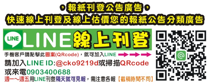 ●四格(4單位)刊登:見報約5X8公分→1天/則海外版費用另有優惠價→洽詢專線