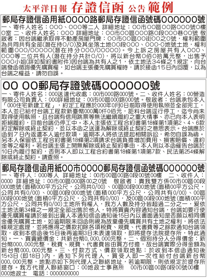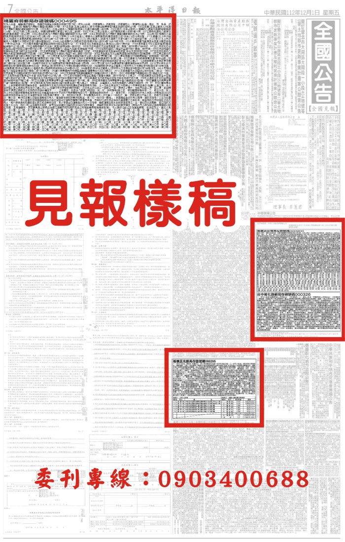 拒不.催告.過戶刊登-太平洋日報-全國版公告公示廣告1天200元郵資另議-附2份報紙