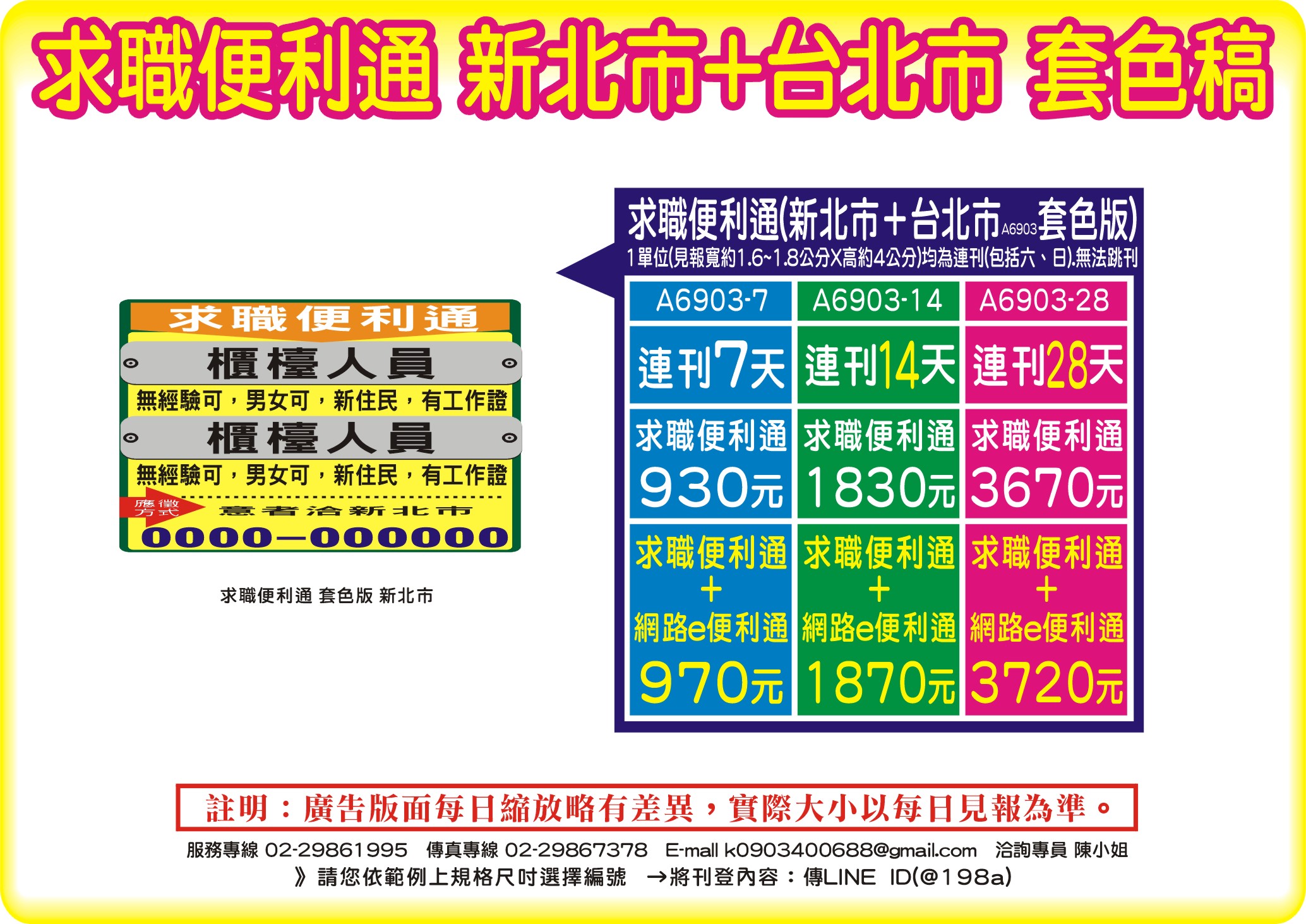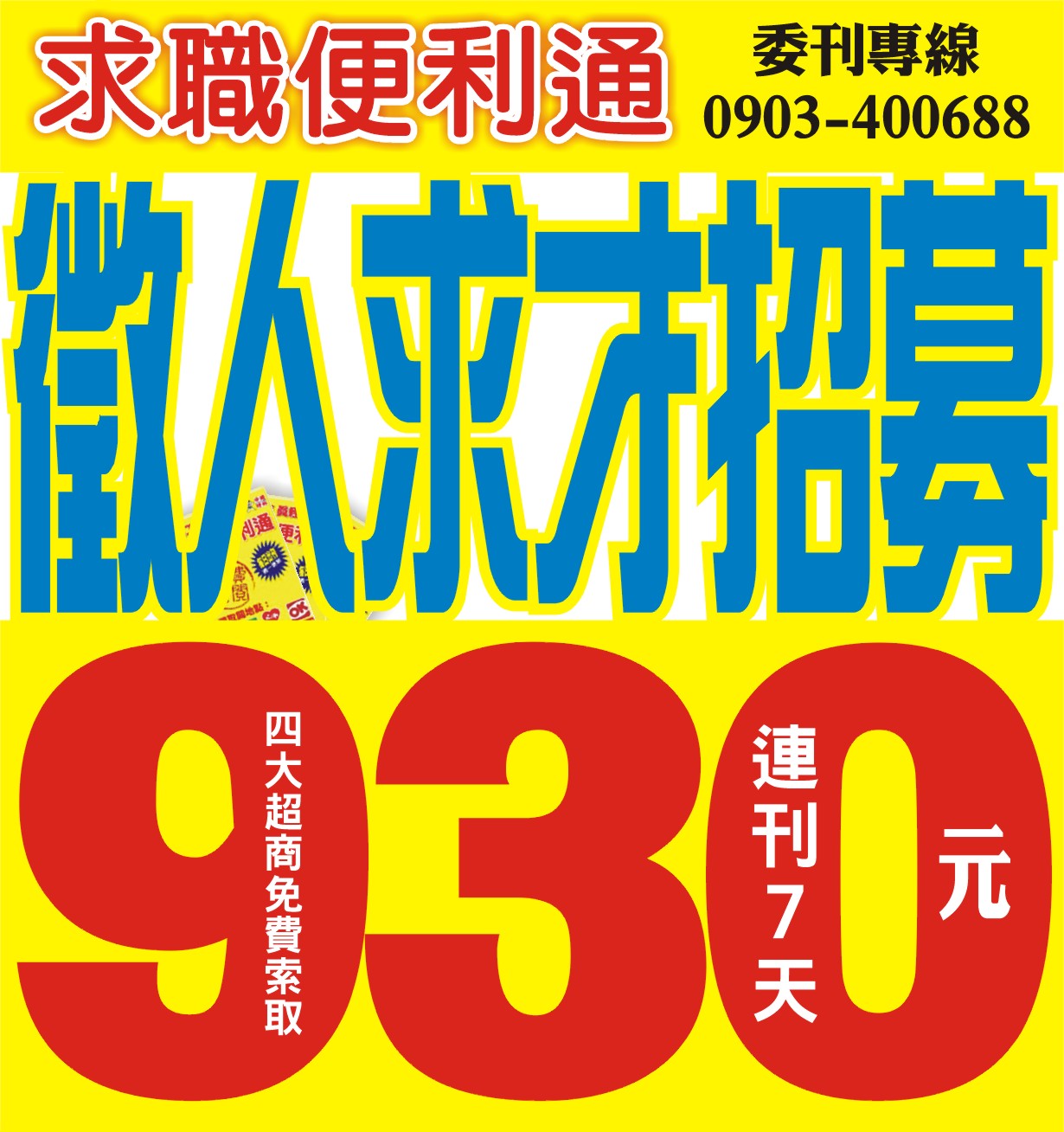 求職便利通連刊7天930元起↑-徵人求才招募-報紙刊登廣告+網路-台北市+新北市