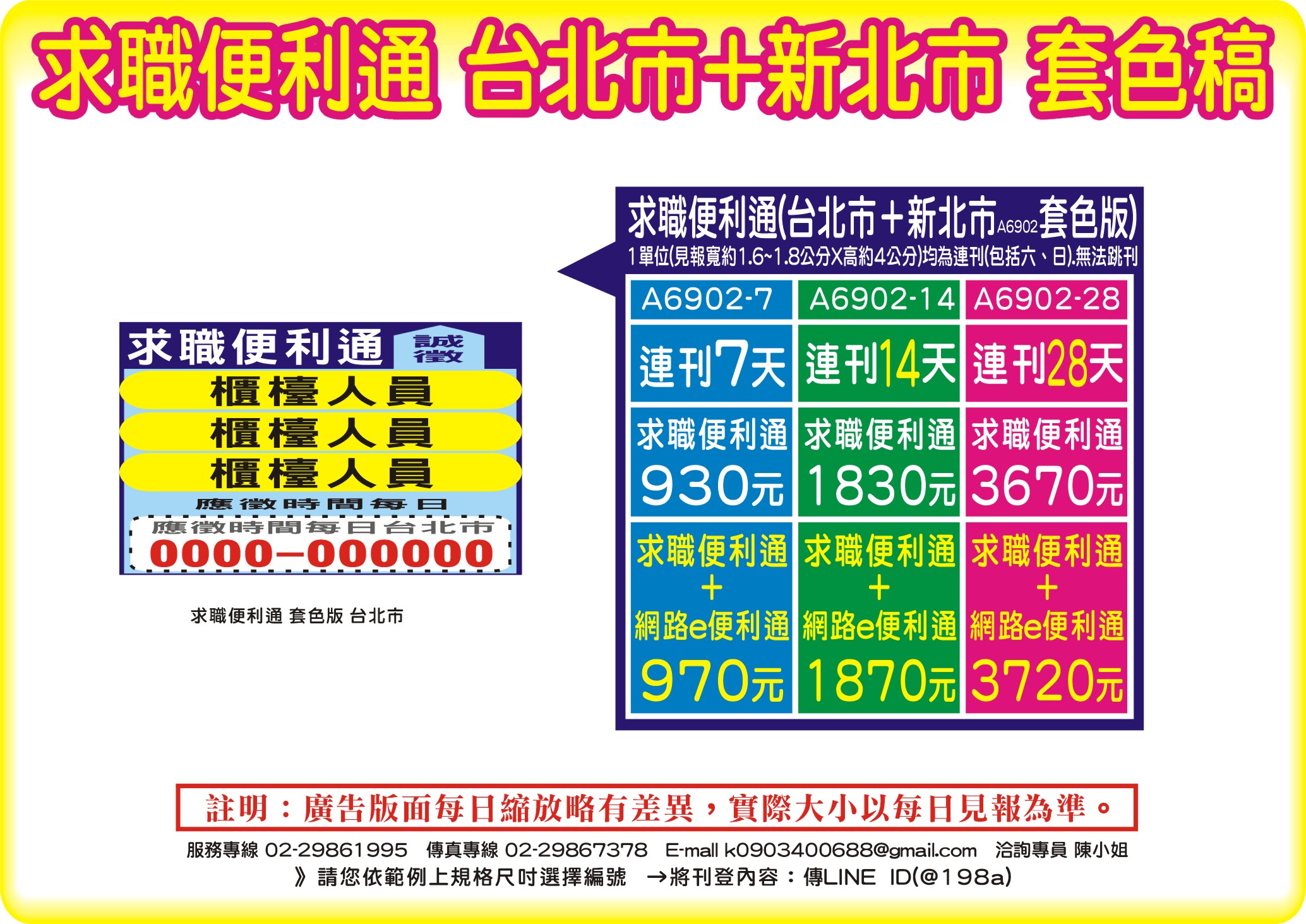 ●台北市+新北市-套色稿徵人求才招募廣告報紙登報●連刊7天930元。連刊七天+網路e便利通970元